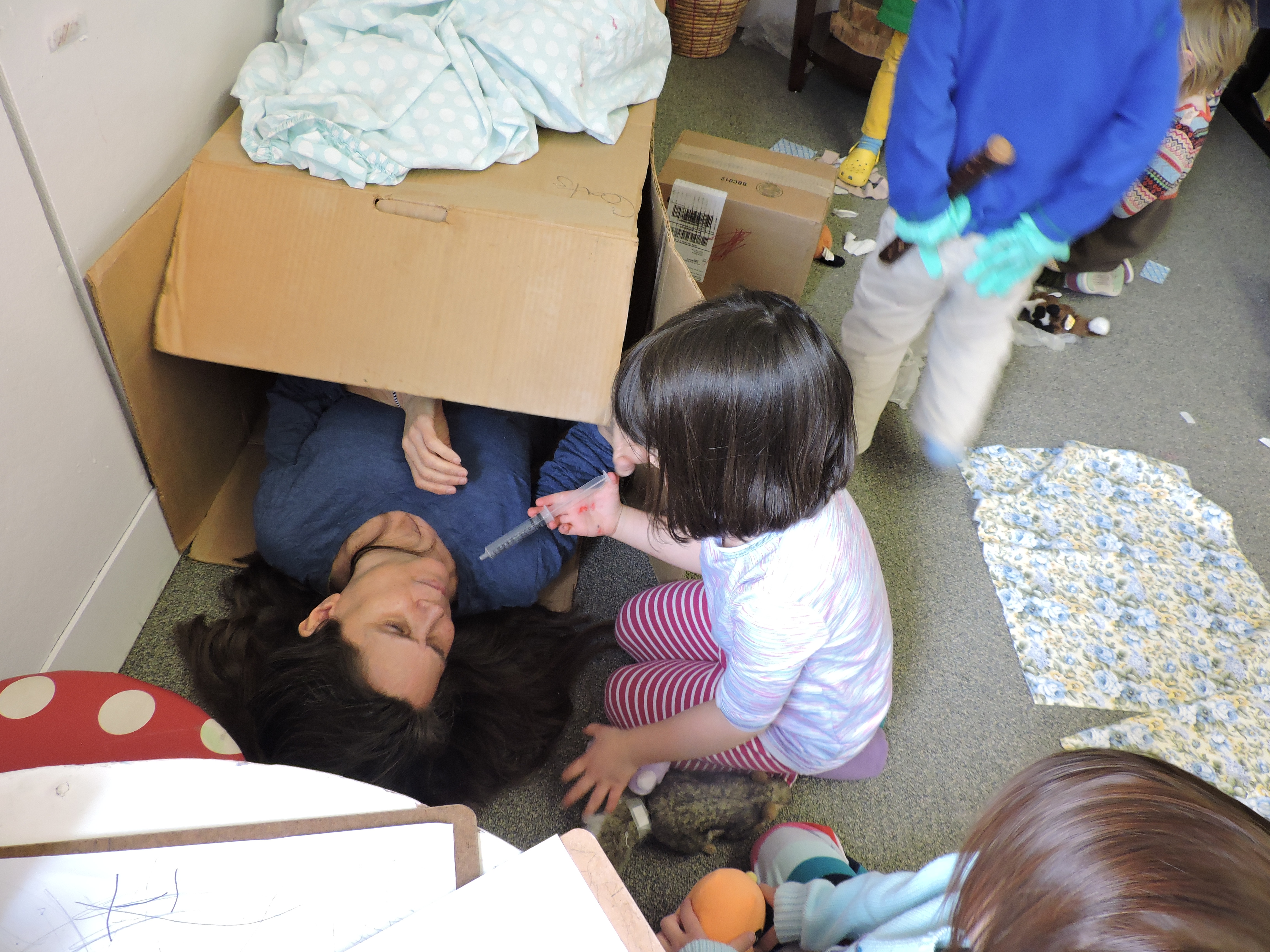 Over the past few weeks we have been enjoying using the bakery set up by Studio Yellow. The food the children were making in the bakery began to be used for the animals in a different part of the studio. These animals were sick and in the animal hospital. We asked the children what supplies a hospital needs to help its’ patients.