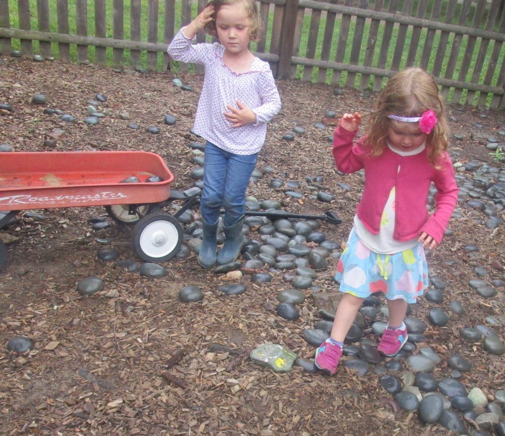Charlie walks on top of the rocks surrounding the sandbox. Noticing that the rocks are sandy, she gets a brush to dust the sand off the rocks. Marky, curious as to what Charlie is doing comes over to observe. She points to the table, “There are more brushes over there!” He finds another brush and joins in. Marky says “Now it’s not slippery, right?” Charlie tries out the cleared off rocks. “It’s not slippery!” Marky rushes over as he spies one rock that needs a bit more dusting!
