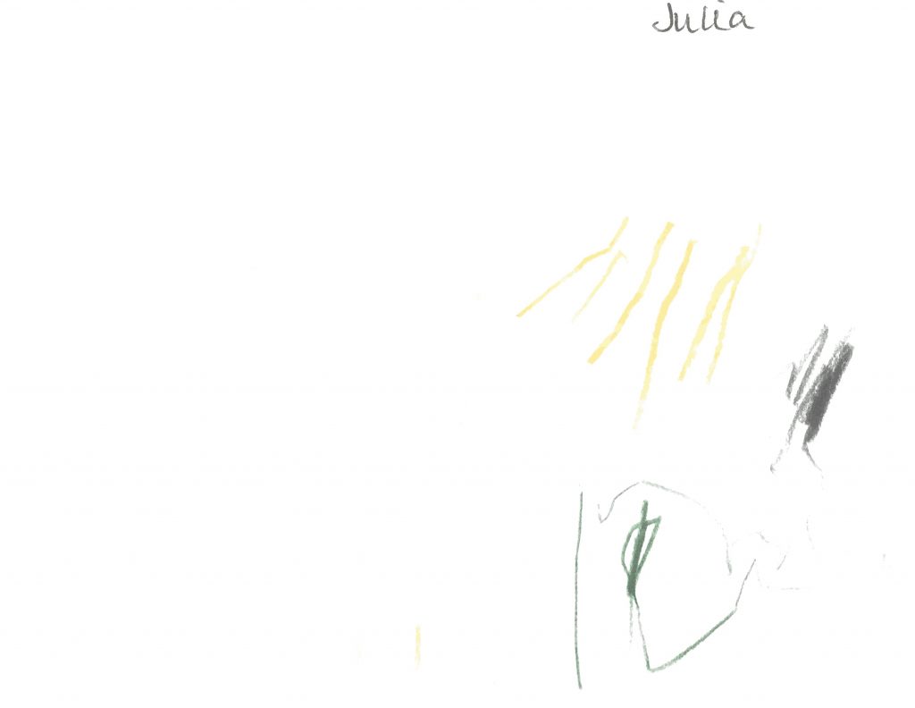 I see it moving. – Julia She begins to draw what she is observing, talking to herself. Does it have this color? Yup it does! Now it needs green. Now this – a little bit of silver.