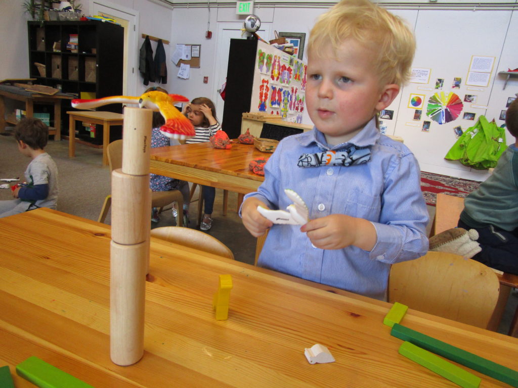 On our table with balancing games, we added some birds. After balancing on blocks and other items around the room, the birds started to balance on unexpected places!