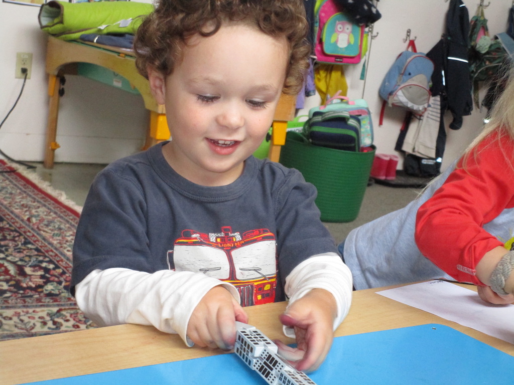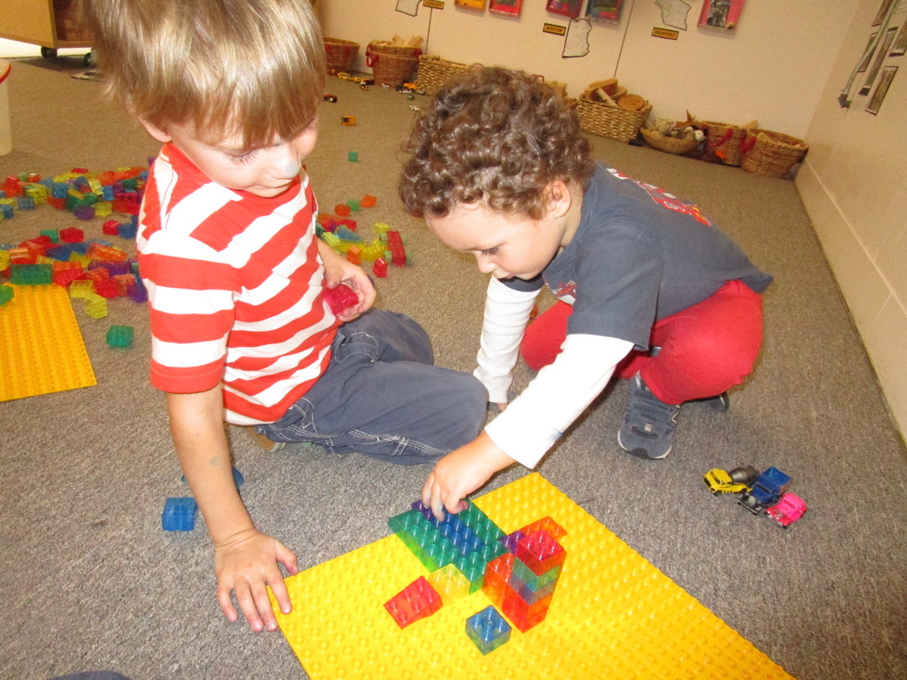 Elliot and Alex play together sharing their fascination with the new manipulative toys.