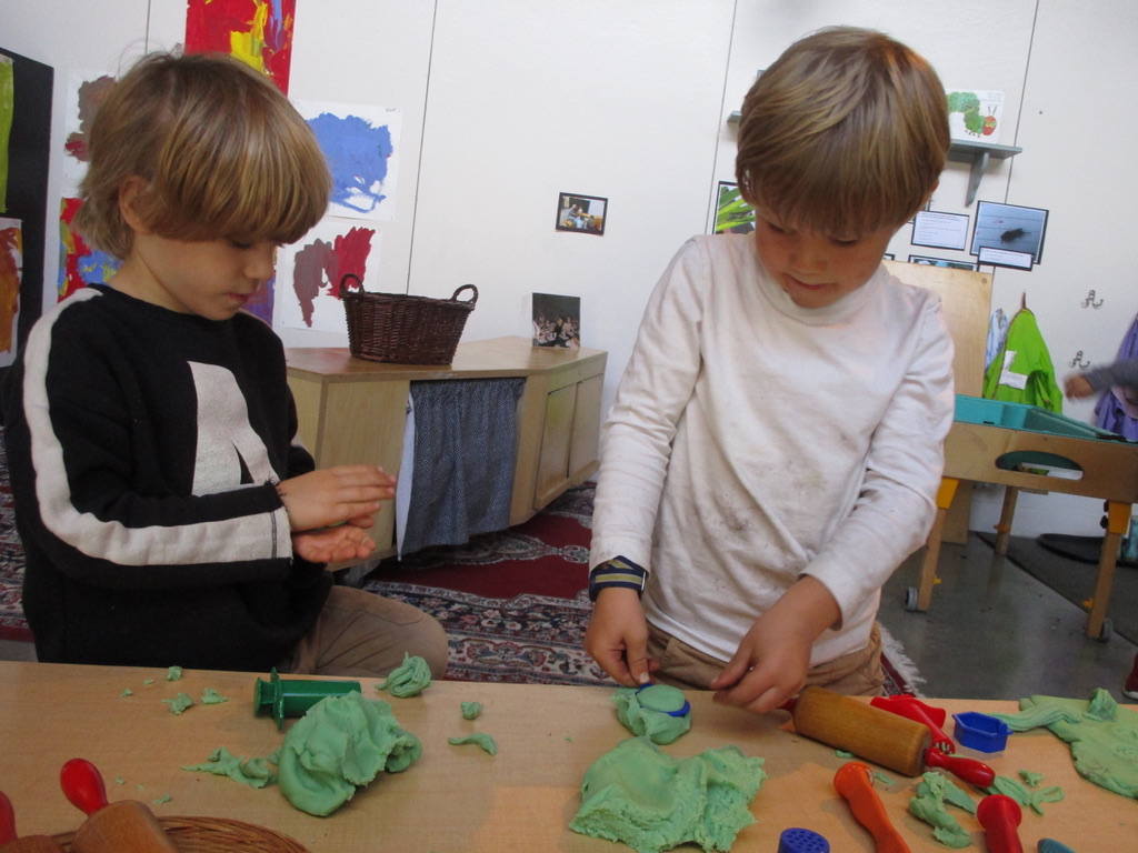 The children have been exploring playdough and using tools to roll, pound, cut and make textures. Making food, such as cookies, cakes, spaghetti and meatballs, have been a popular theme lately.