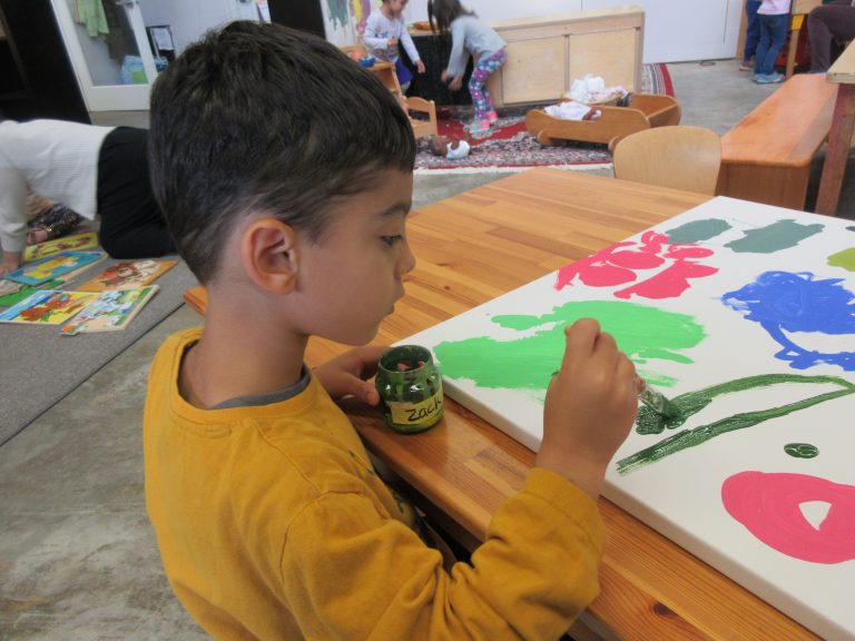 To begin to draw this group of individuals into one larger group we decided to start with paint. Not all three year olds are attracted to paint and painting but all three year olds love to experiment. Each child was asked to mix a jar of paint. Sometimes the child chose their favorite color, others just liked to mix! Some children chose to mix many jars of paint whilst others mixed just one. While mixing their paint they created their own color swatch. These swatches formed a collaborative color wheel.